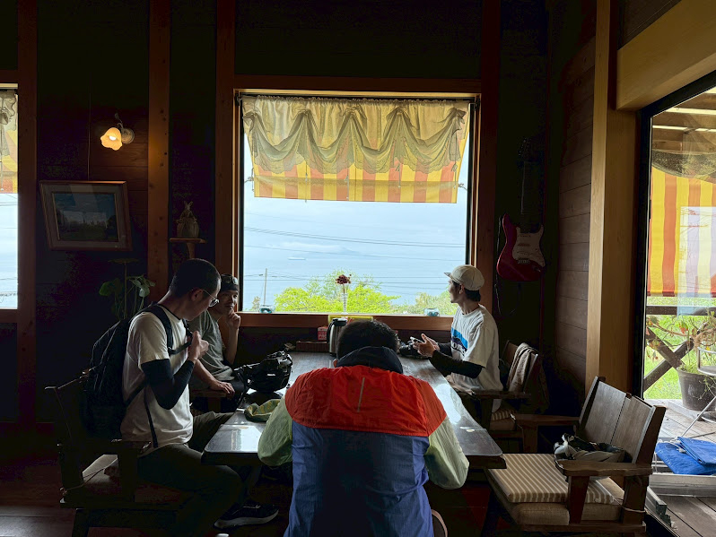 海の見える窓を覗いてのんびり話したり軽食をつまんで談笑。