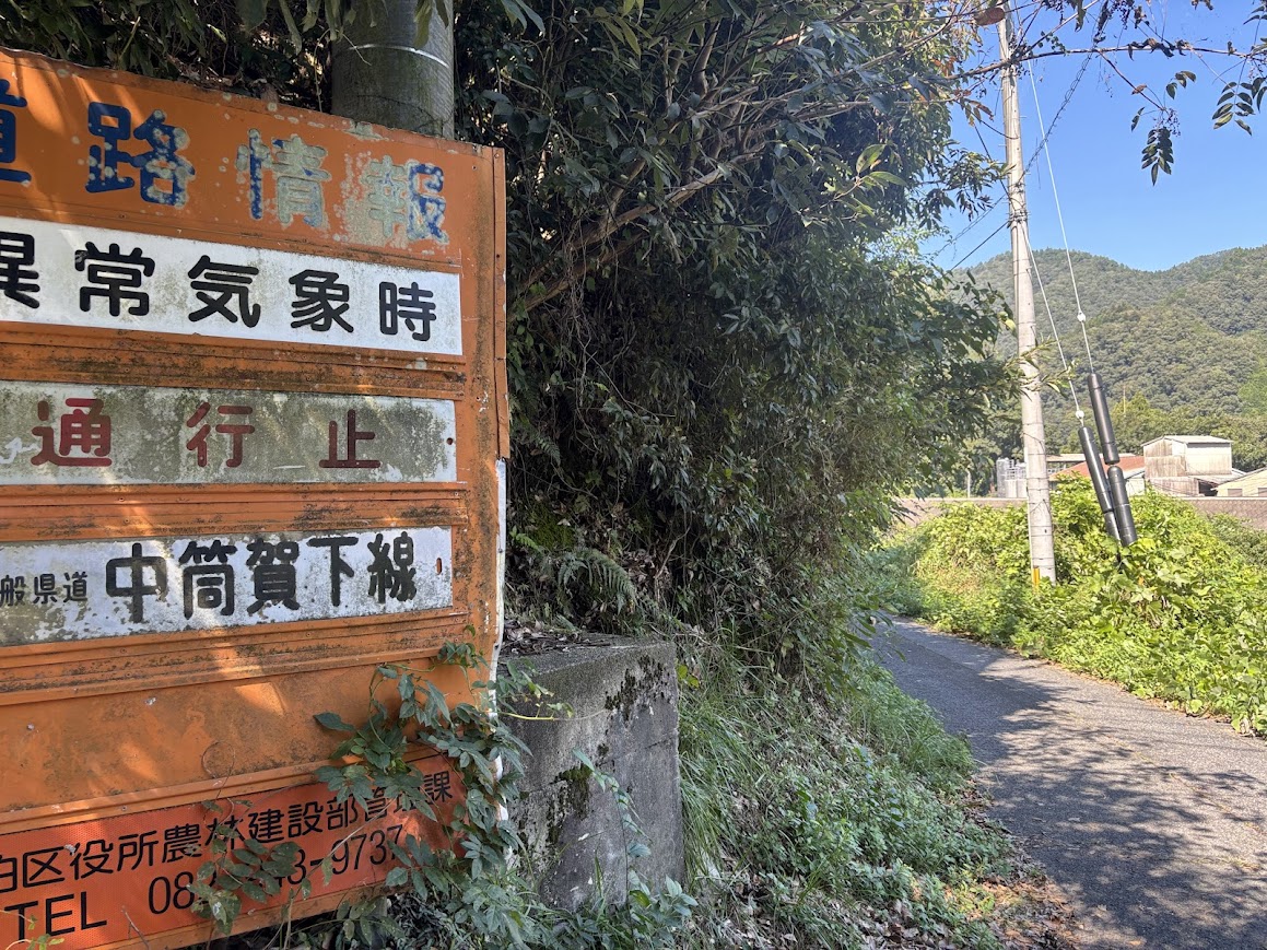 交通量のある191号線は避けて手前の県道中筒賀下線へ左折します。このルートは車で行くには狭く通り抜けが難しい道ですが、国鉄時代?の廃線跡の名残が多く残されており何だか歴史を感じることのできる面白いルートでした。
