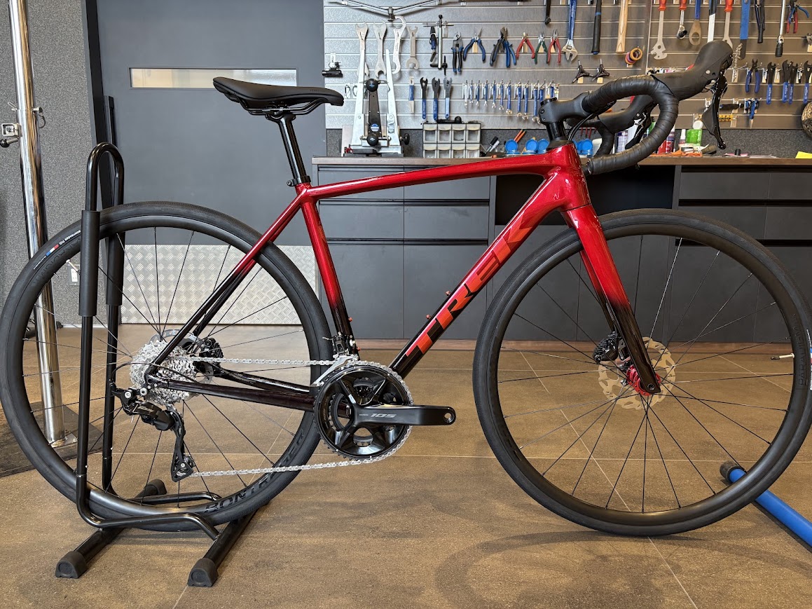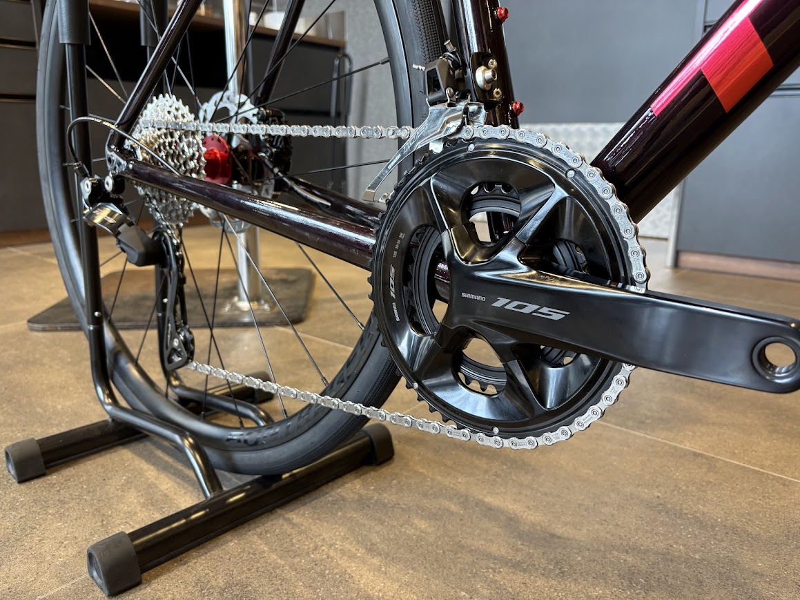 軽量かつ12速105と、ポテンシャルは高くレースでも活躍ができ、もちろん日常的なライドにも快適に乗れる設計なので、長距離ライドや週末ライドでも楽しむことのできるバイクです。今回は最初からタイヤサイズを変更してのご納車となりました。より本格的なバイクが欲しい方にお勧めのバイクです!