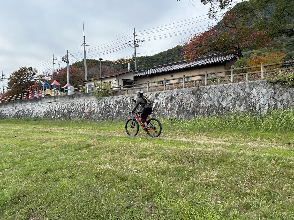 終盤、川土手の未舗装区間を爆走するA様のMTBは今回も圧巻!