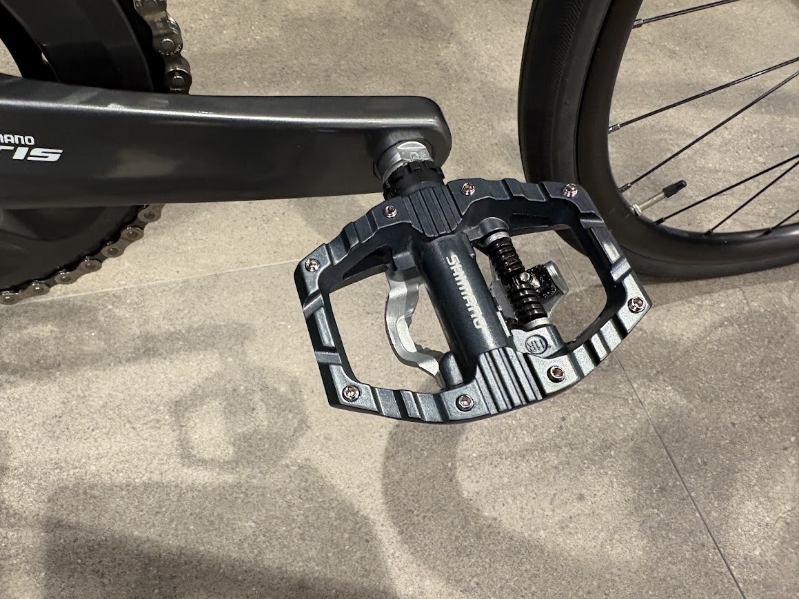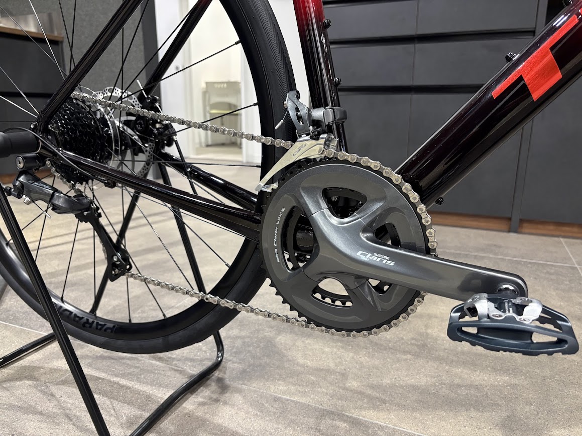 ロードバイクの入り口として人気の、DOMANE AL2をグレードアップしてご納車しました!純正のシマノクランから、AL2のコンポーネントであるクラリスのクランクへバージョンアップ!これにより、BBも変更されます。というより、BBを変更するためにクランクを変えたといっても過言ではありません!変更するメリットは、しなりを軽減し踏み込んだ時のダイレクト感を向上することです。アウタートップで踏み込んだ時に、BB周りがしなることによるチェーンとディレーラーの干渉を防いだり、エネルギーが分散されにくくなります。また、SPDペダルも付けさせていただきました。本格的な、ロードバイクライフの始まりです!